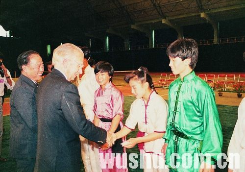 原国际奥委会委员何振梁在观看完武术表演后与外国运动员亲切握手(下图)